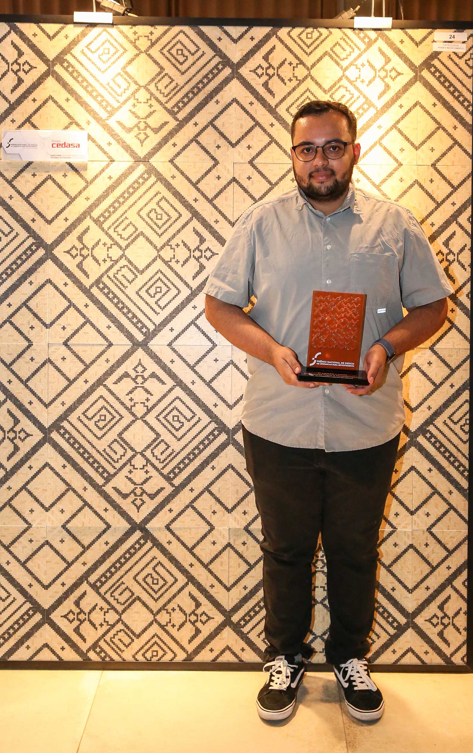 Arumã, a cerâmica vencedora na Categoria Pisos e Revestimentos, traz como referência um tipo de cesto raso presente na cultura Yanomami - grupo indígena que habita a região norte amazônica. O objeto é produzido pelos homens da tribo e decorado com padrões gráficos diversos tingidos com corantes naturais, sobre um complexo trançado em fibras de arumã. A função do utensílio é servir como uma espécie de bandeja para a disposição de frutas e outros alimentos, coletar a massa de mandioca, bem como acondicionar o beiju, além de alimentos consumidos de forma coletiva no âmbito familiar.